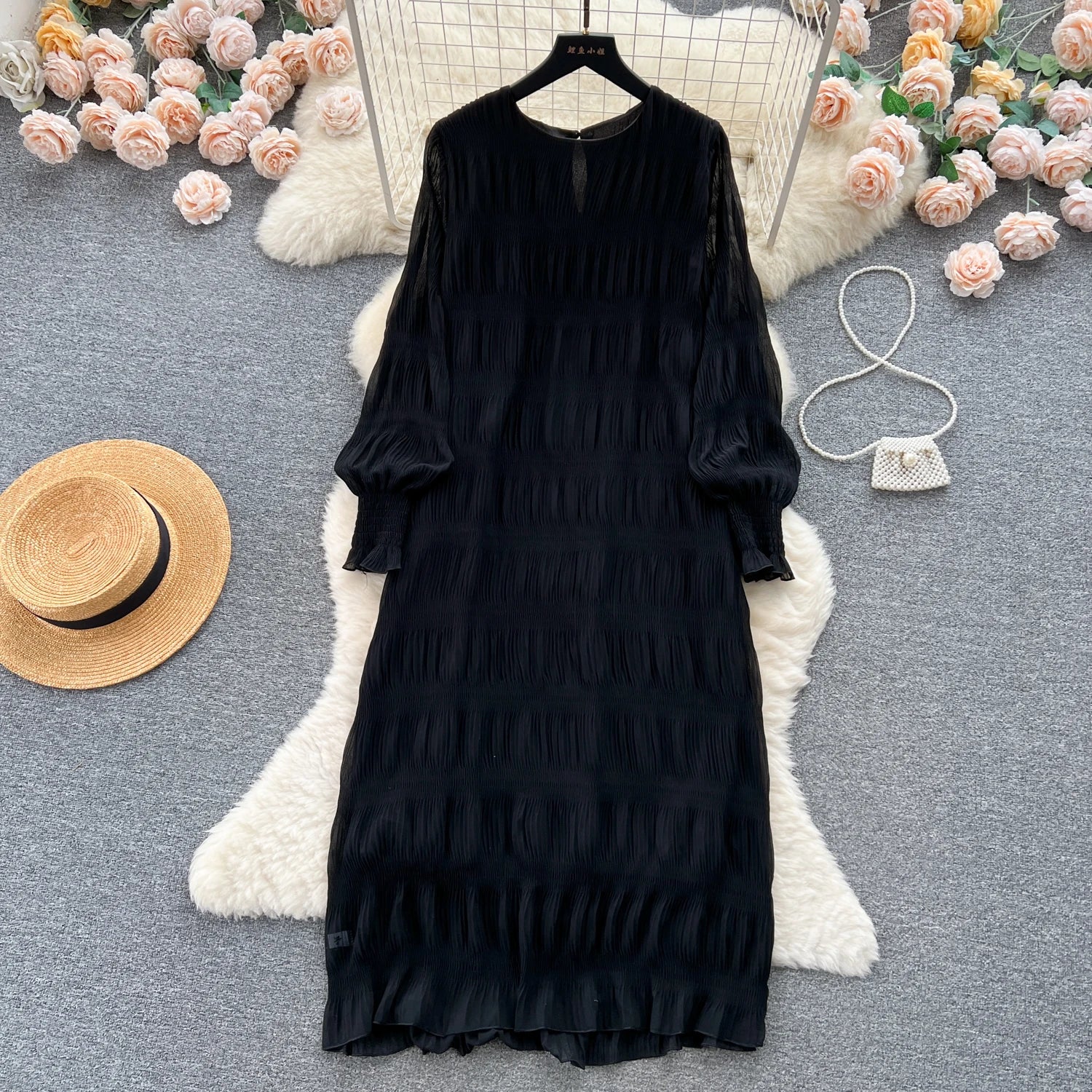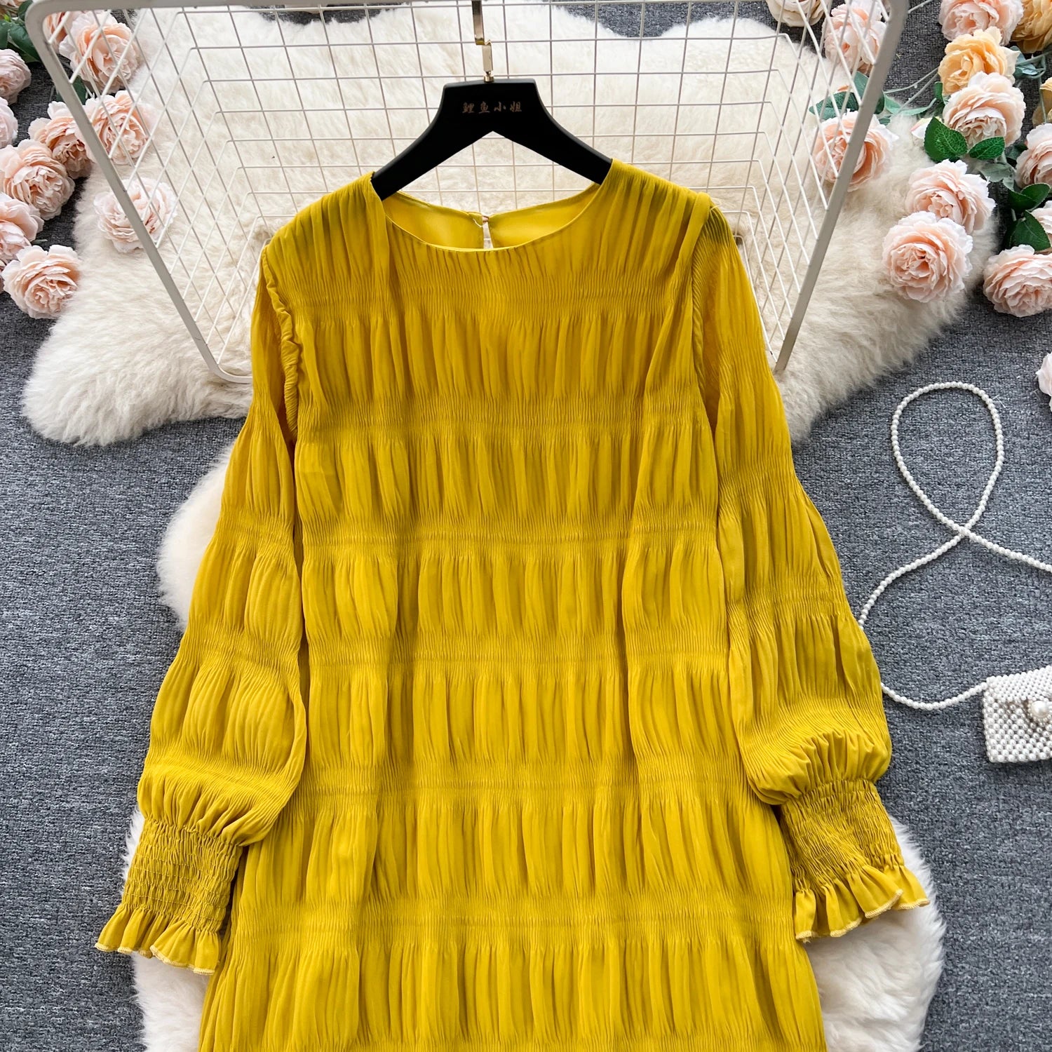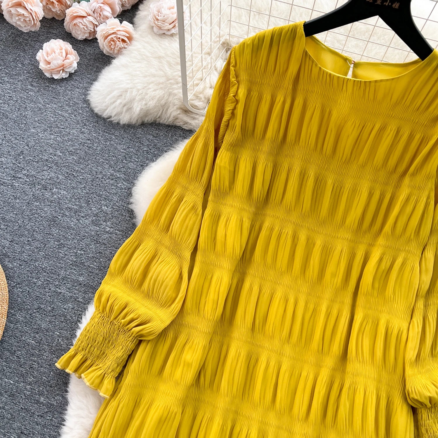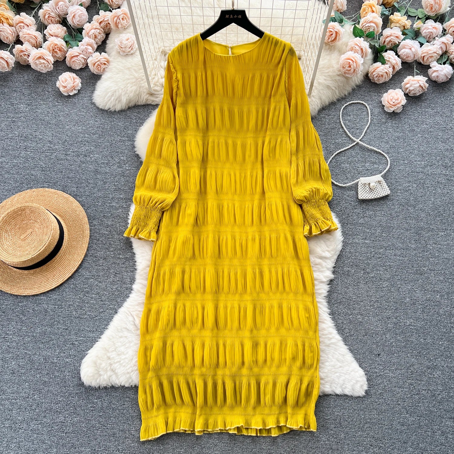 Autumn Vintage Women Draped Loose Midi Dress Elegant Round Collar Puff Long Sleeve Robe Casual Yellow/Burgundy/Green Vestido New