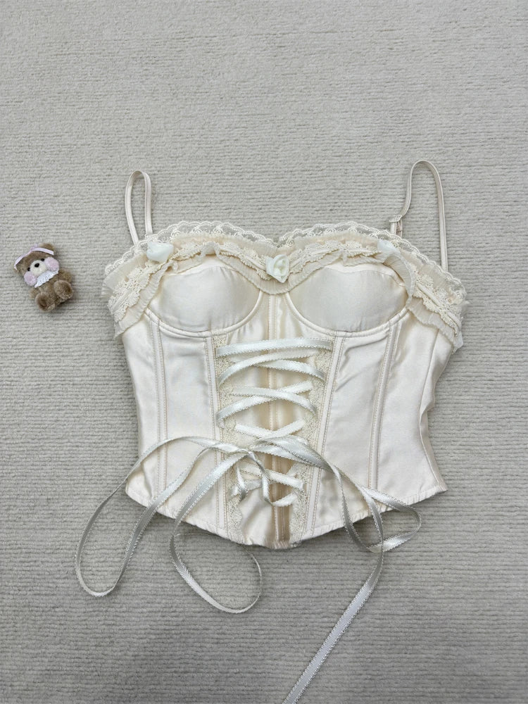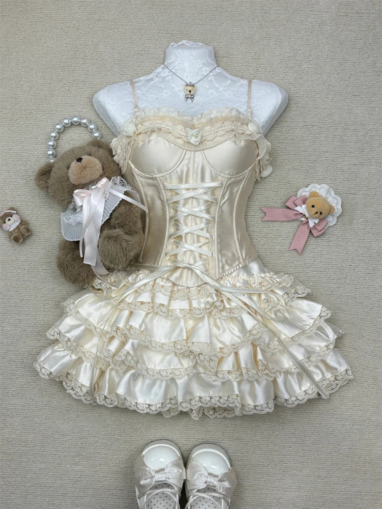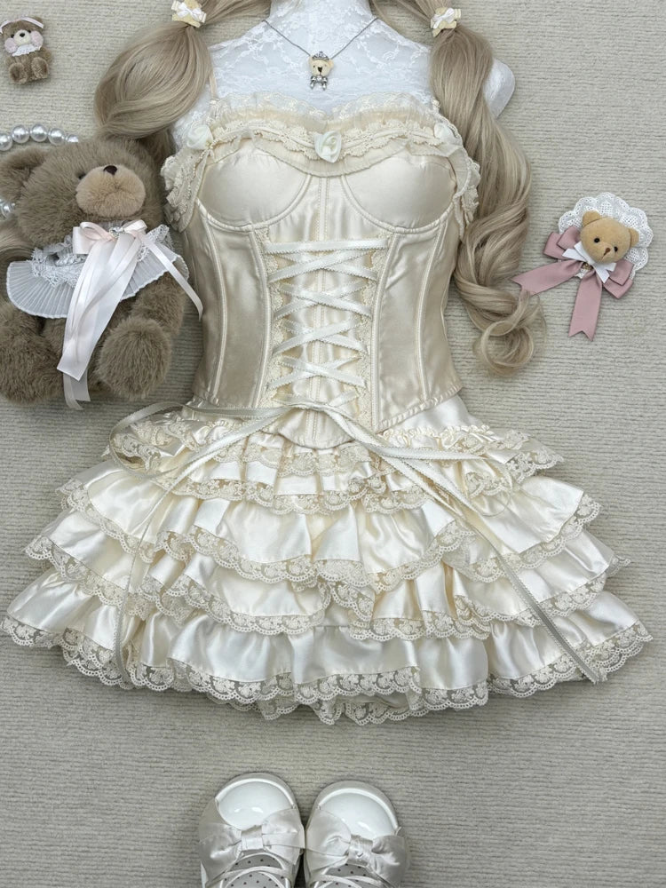 French Elegant Sexy 2 Piece Sets Womens Outifits Y2k Strapless Lace Design Tops+ High Waist Chic Skirt Female Korean Fashion New