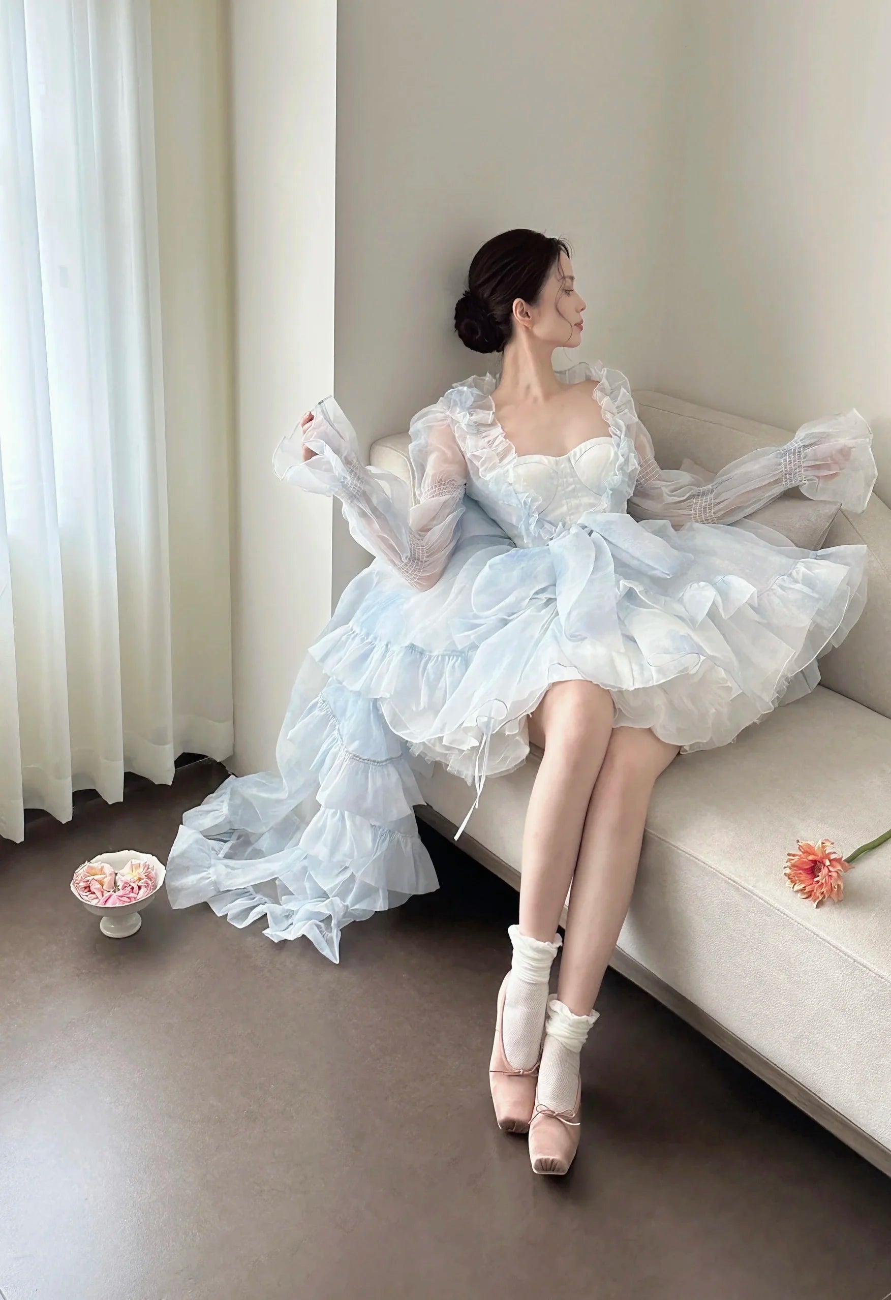 French Style Flower Wedding Dress Lolita Sweet Girl Women Fairy Tube Top Sling Dress with Long Cardigan Birthday Princess Dress