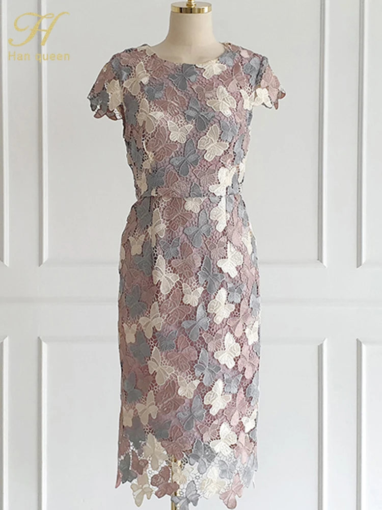 H Han Queen Summer Elegant Chic Lace Dresses Women Korean Retro Vestidos Fashion Color Blocking Office Party Casual Dress