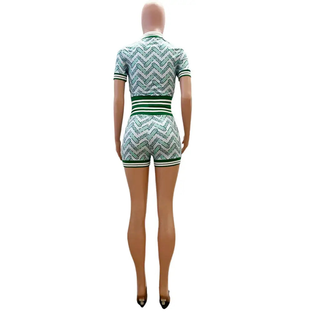HLJ Blue Summer Printing Shorts Two Piece Sets Women Polo Nack Crop Top And Shorts Outfits Fashion Y2K Matching 2pcs Streetwear
