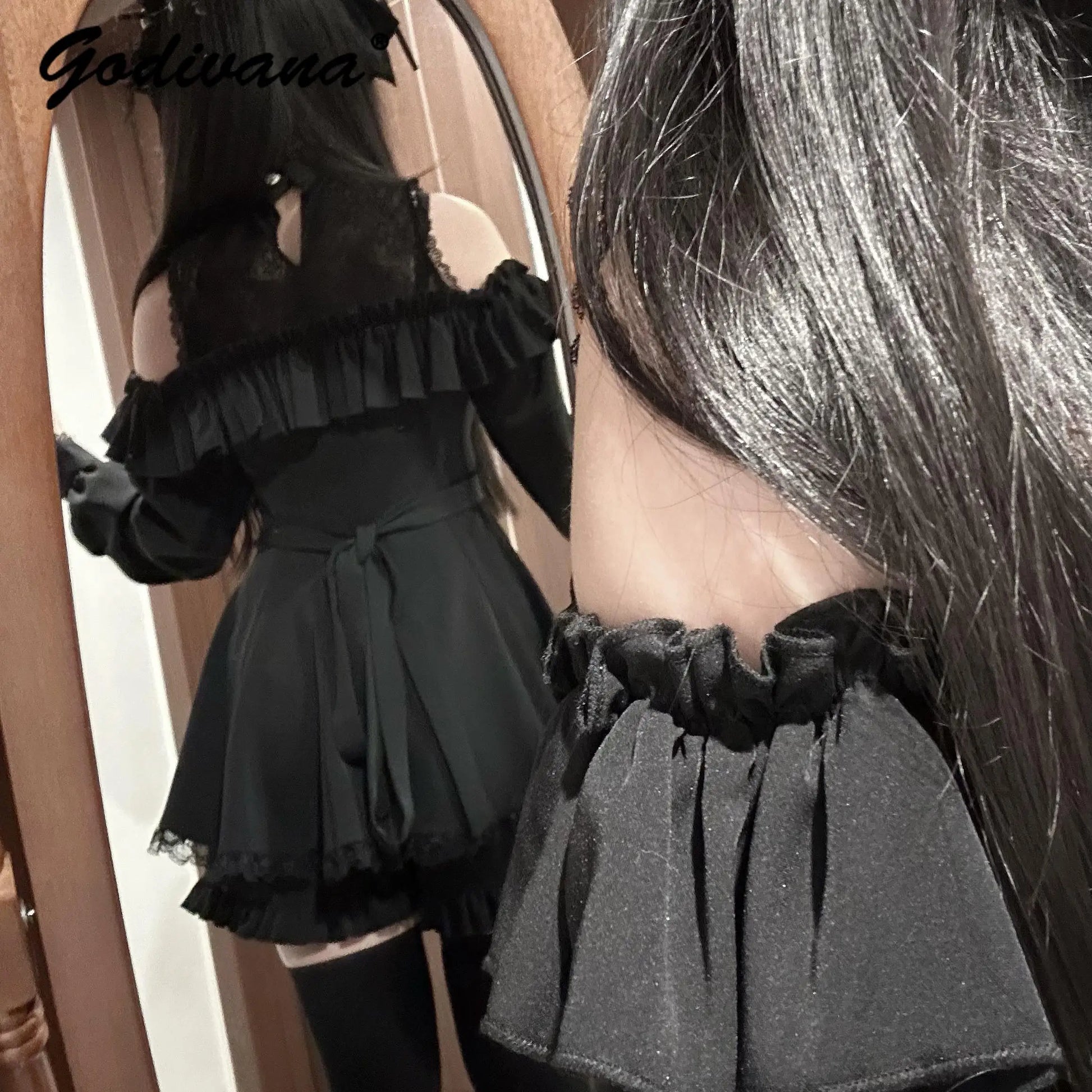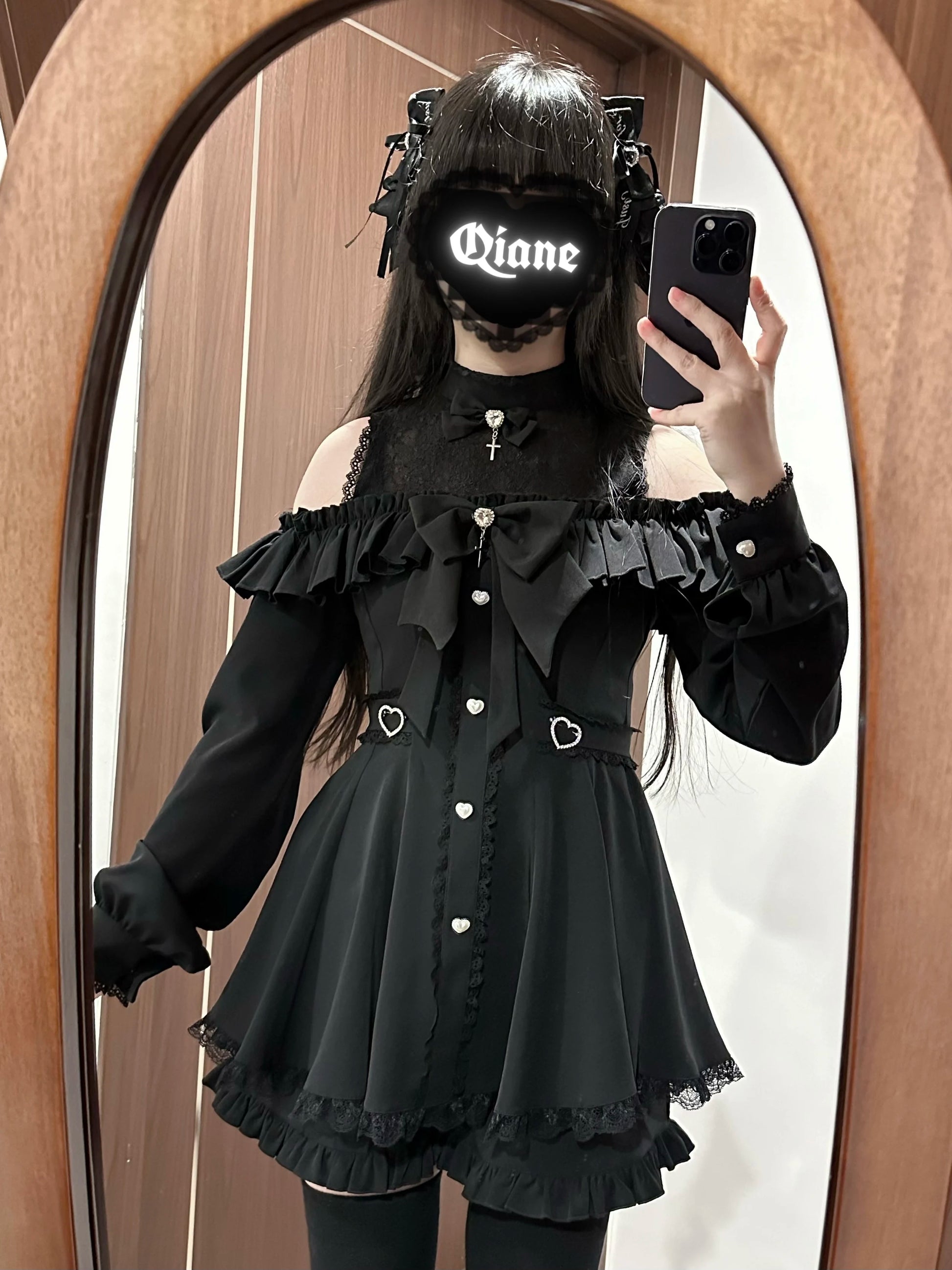 Japanese Mass-produced Off-the-shoulder Lace Splicing Long-sleeved Bow Shirt Dress and Shorts 2 Piece Dress Set Lolita Outfits