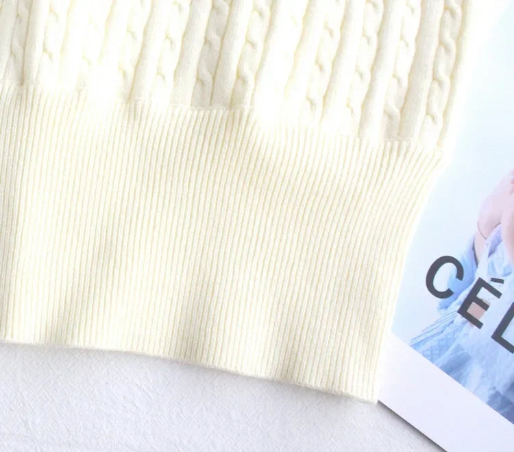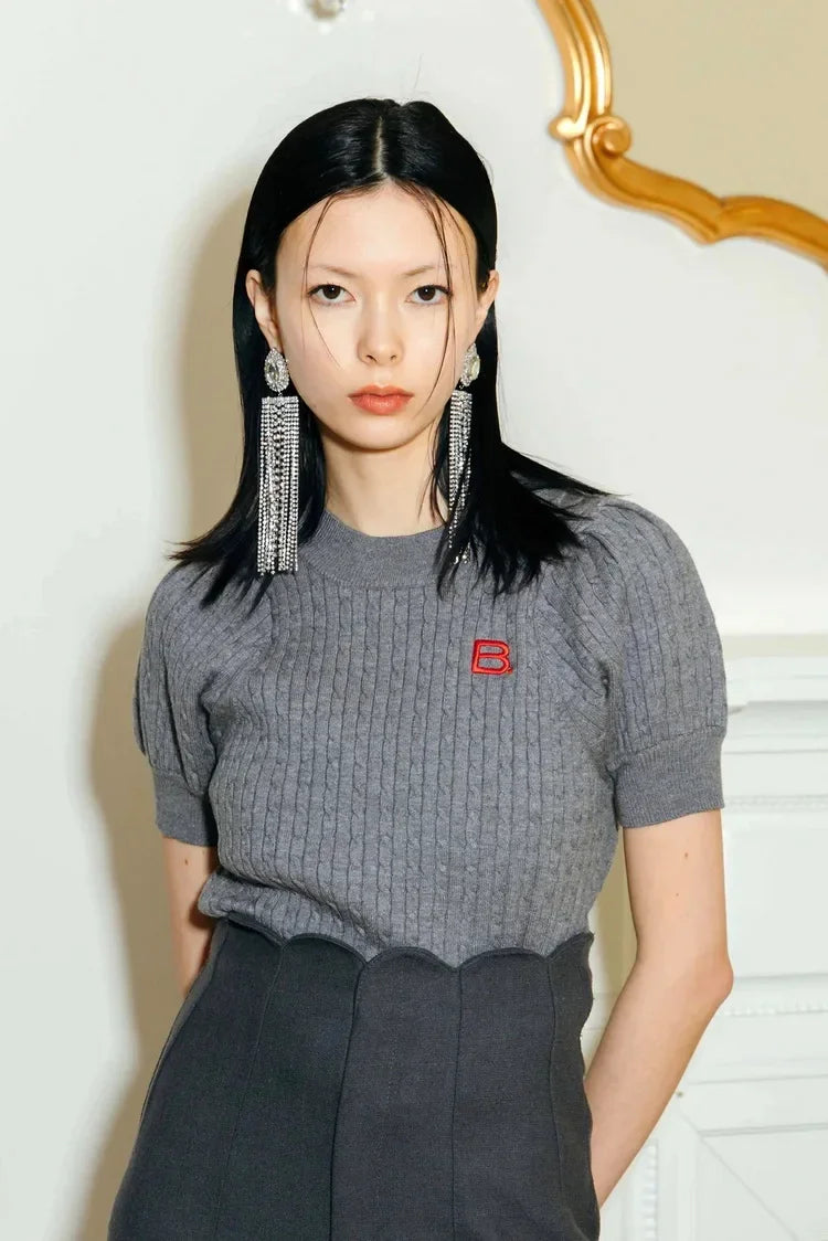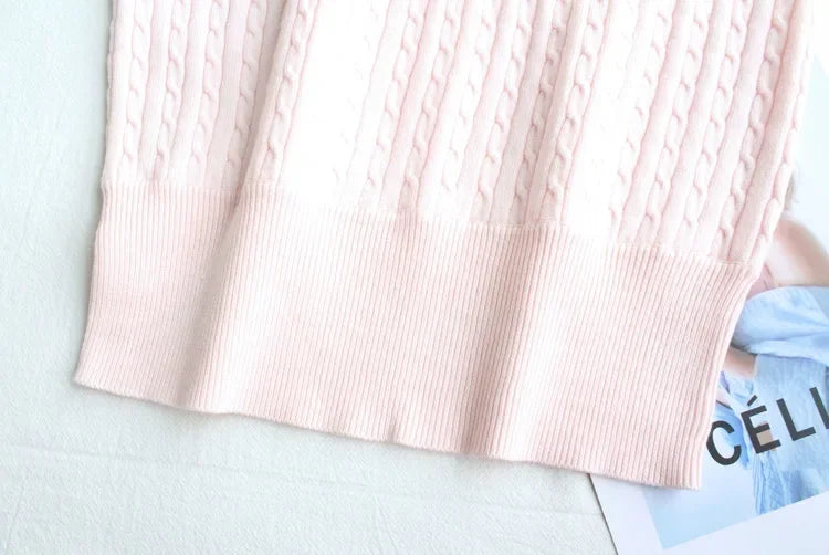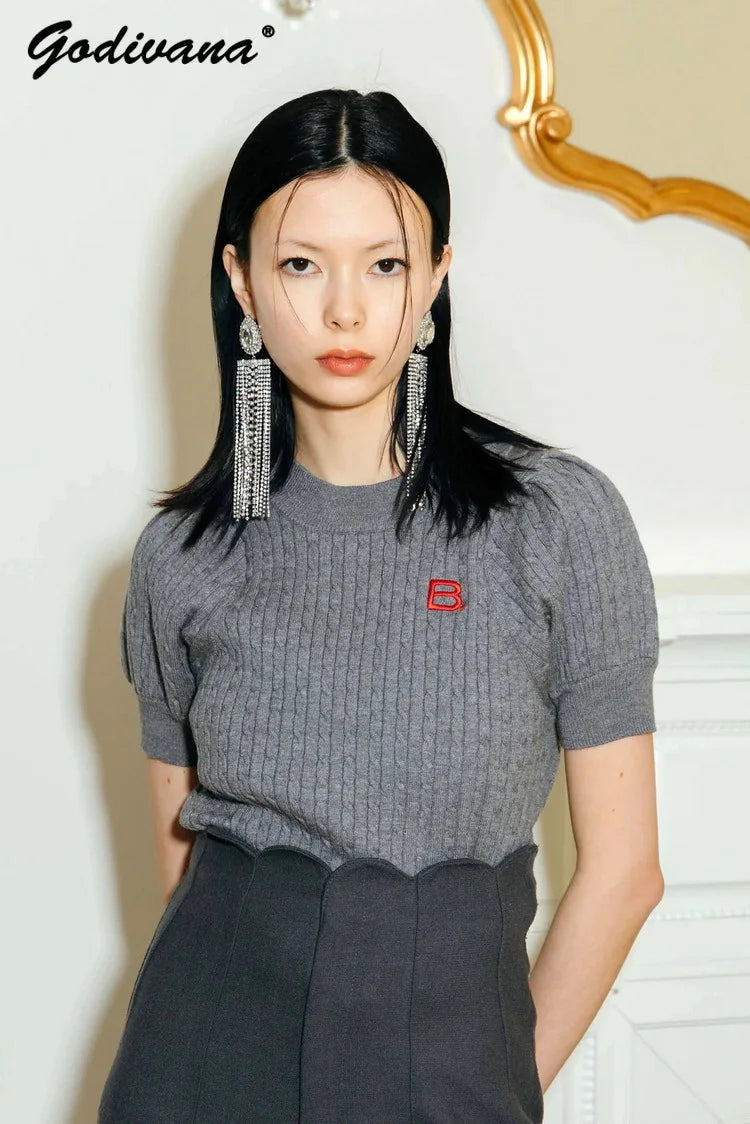 Japanese New Spring Ladies Sweet Bubble Short Sleeve Twist Knitted Top Sweater Letter Embroidered Pure Color Women's T-shirt