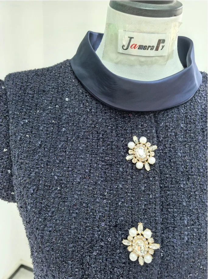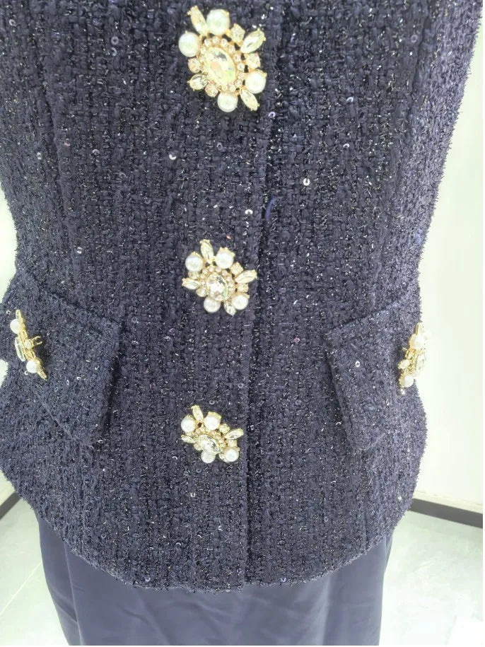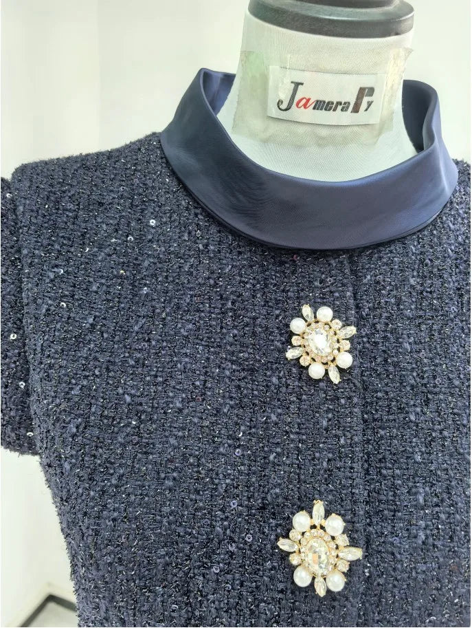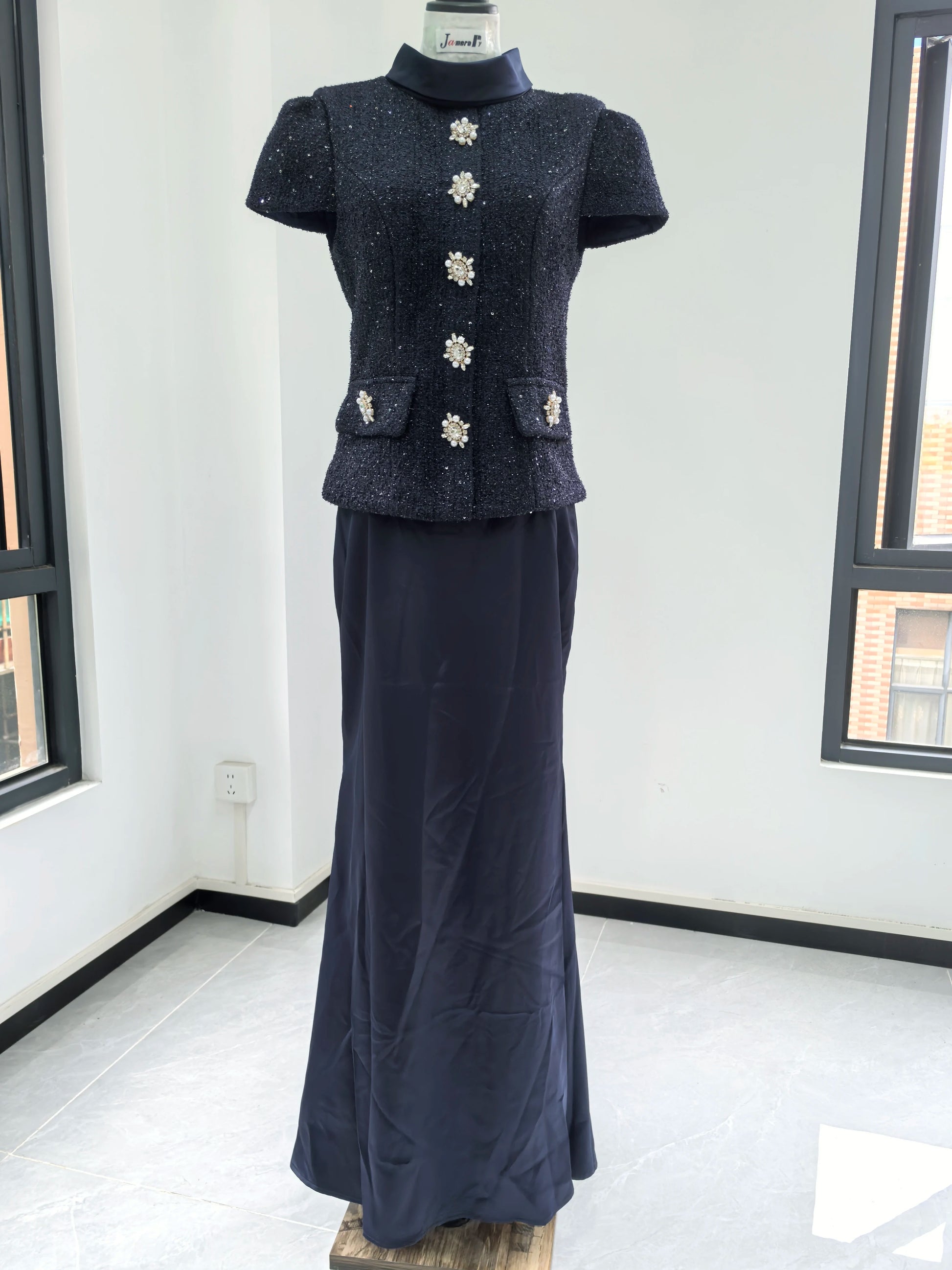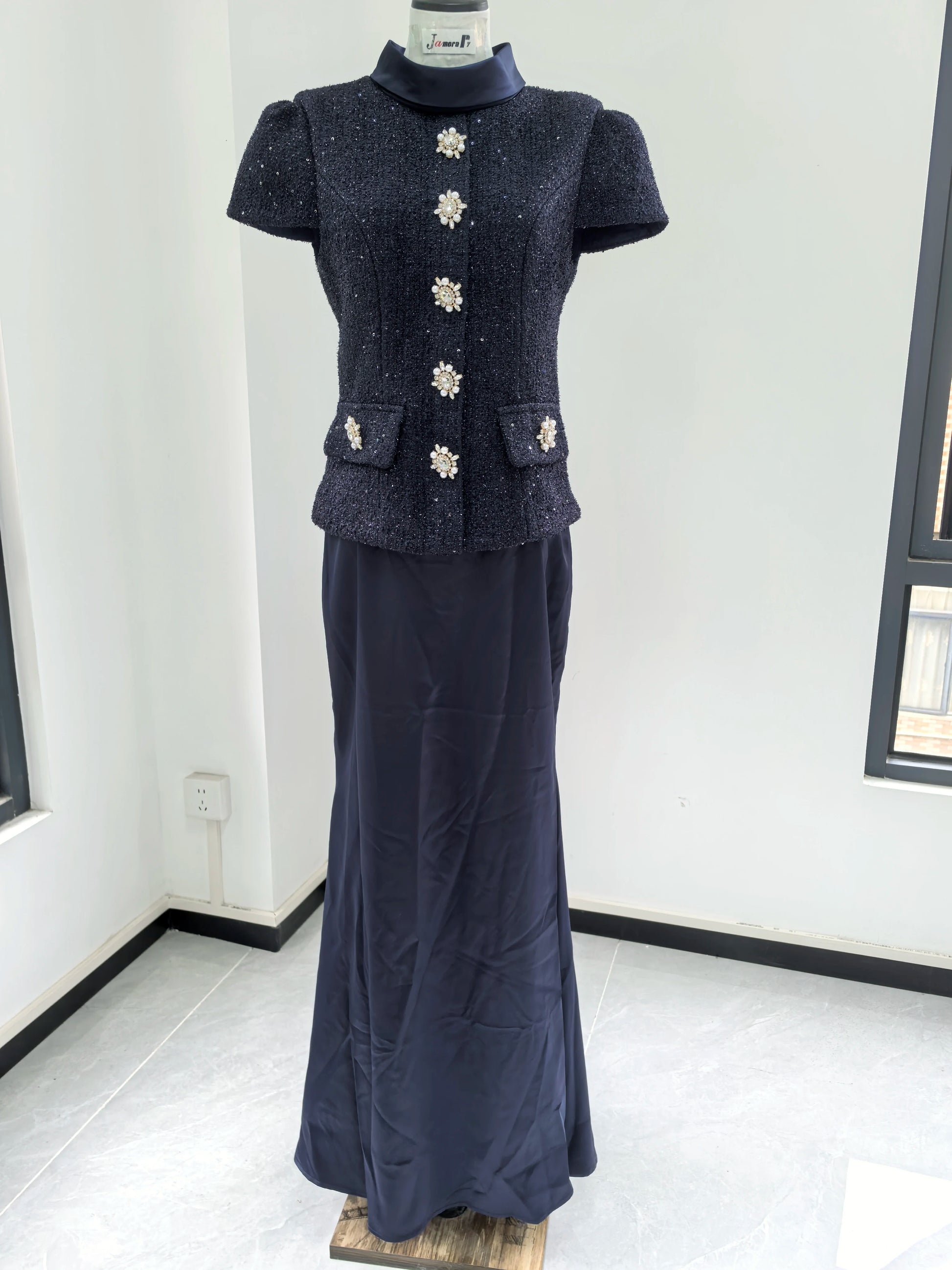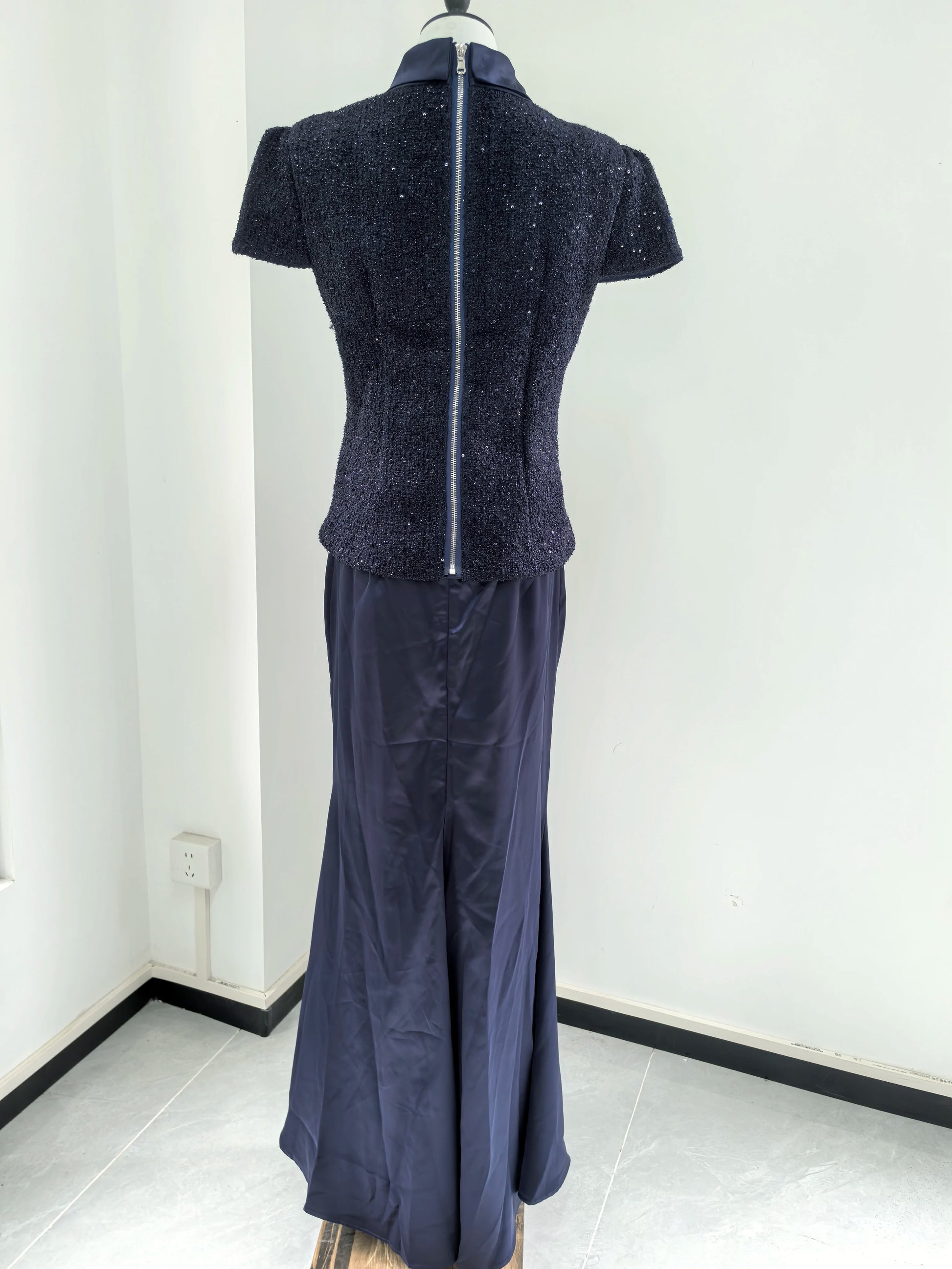 Maxi Formal Luxury Evening Dresses Women Summer Autumn Single Breasted Crystal Satin Tweed Long Dress Blue Party Dinner Vestidos