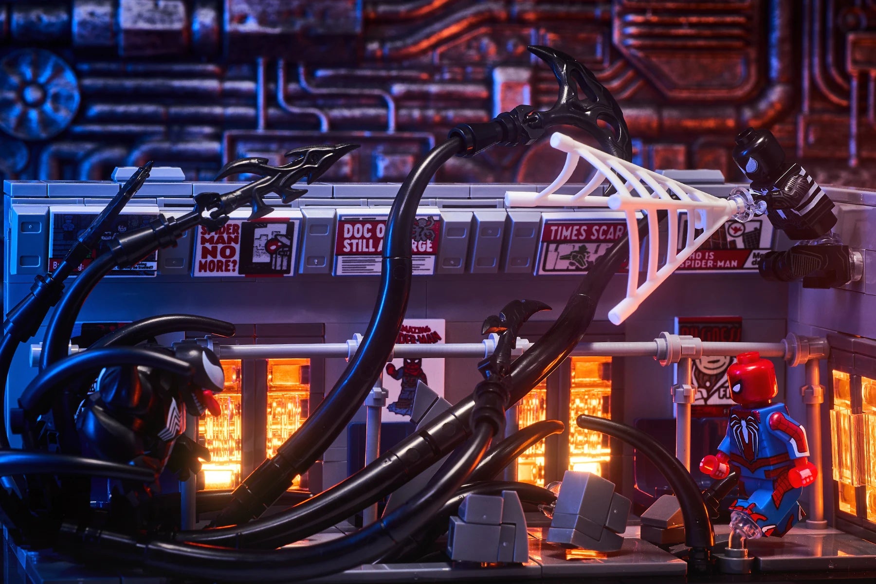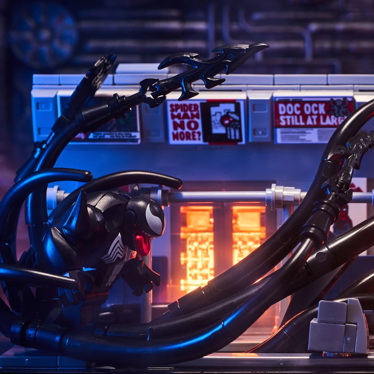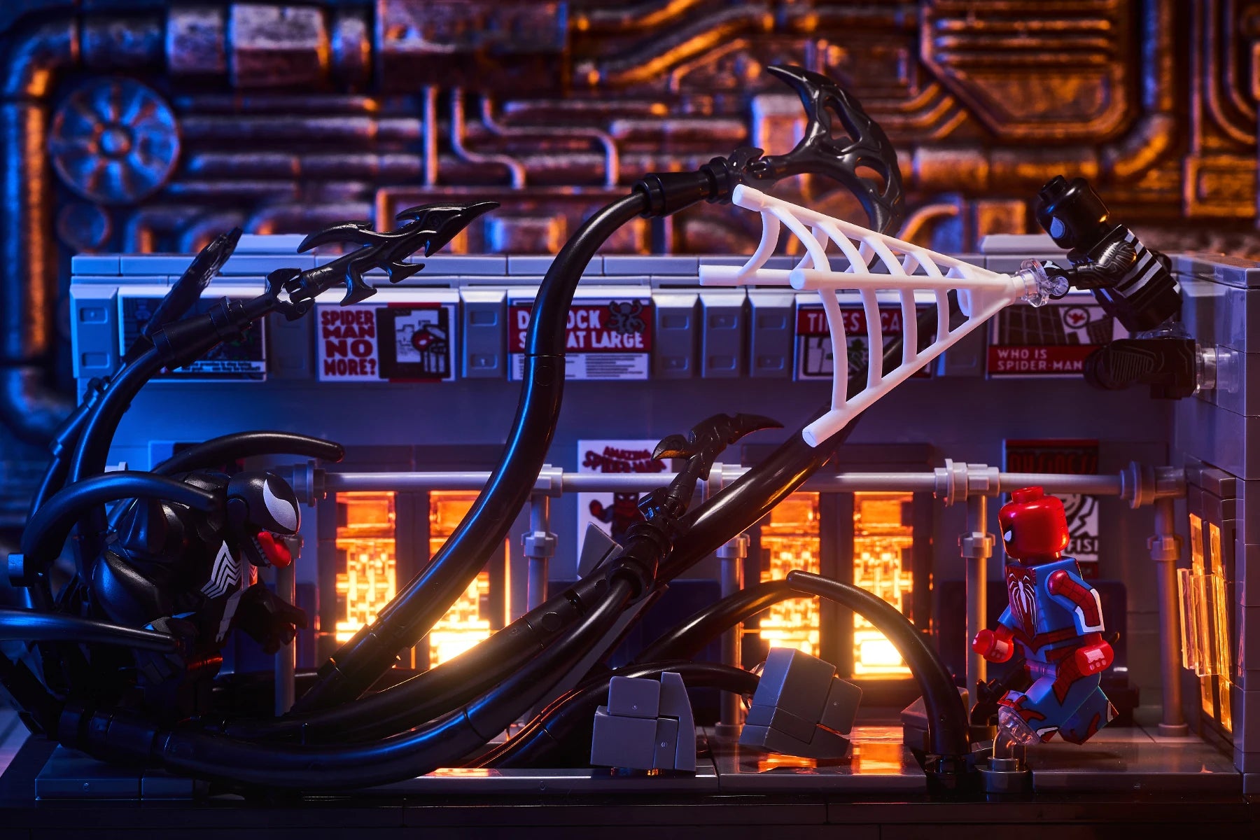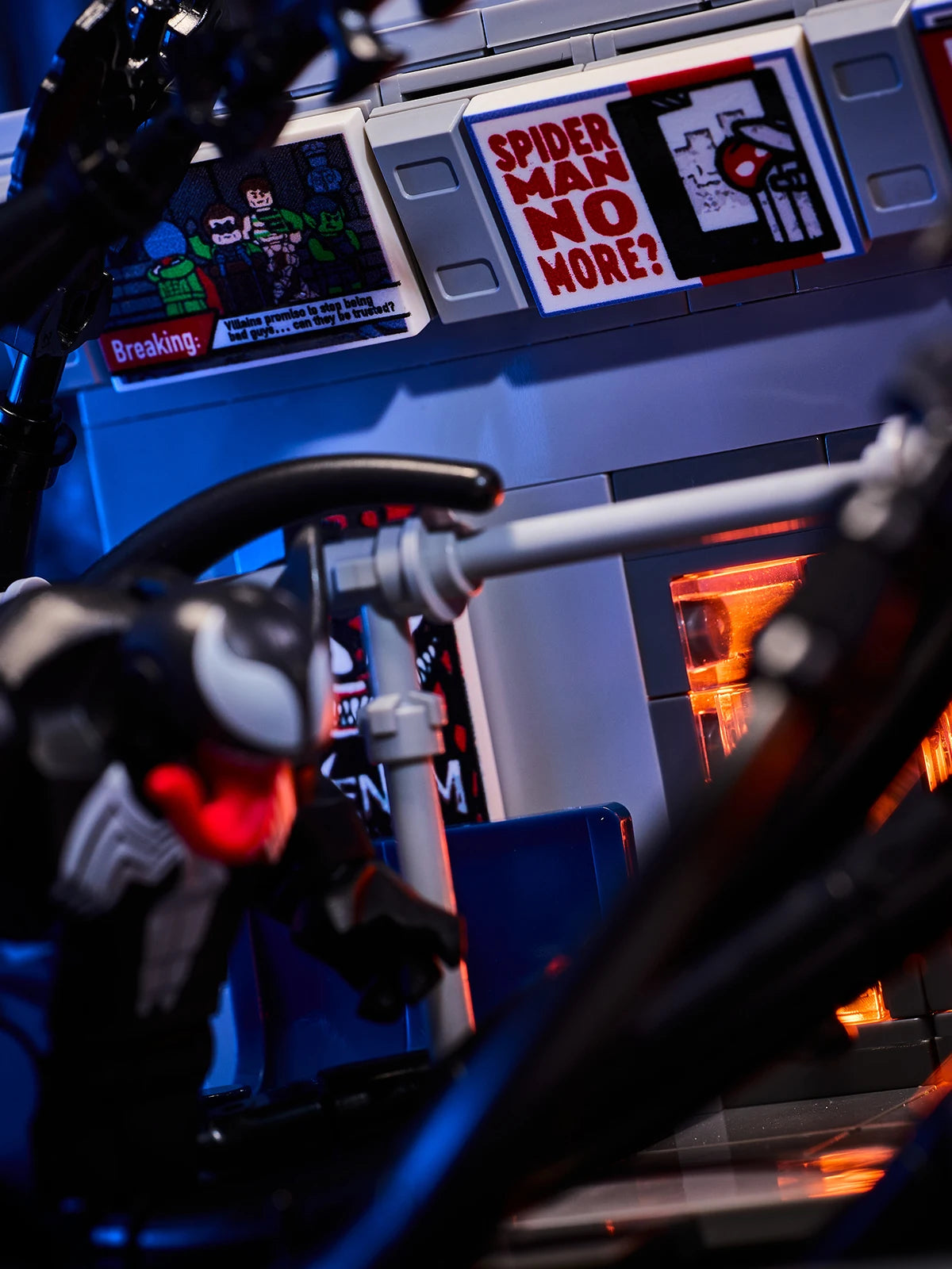 MOC scene: Marvel Venom vs. Spider-Man in the subway. Spider-Man's assembled toy bricks. Christmas gift for a boy and a girl.