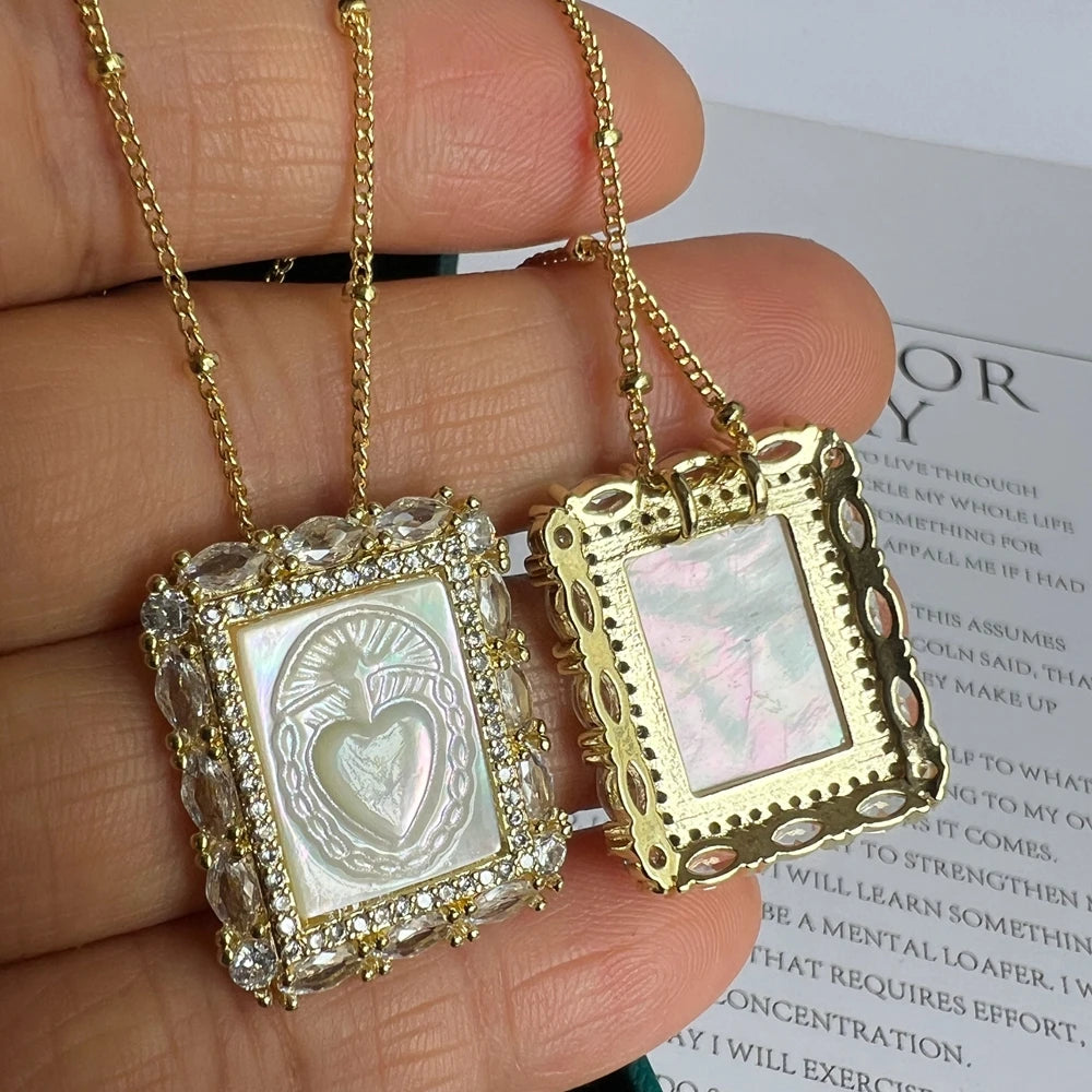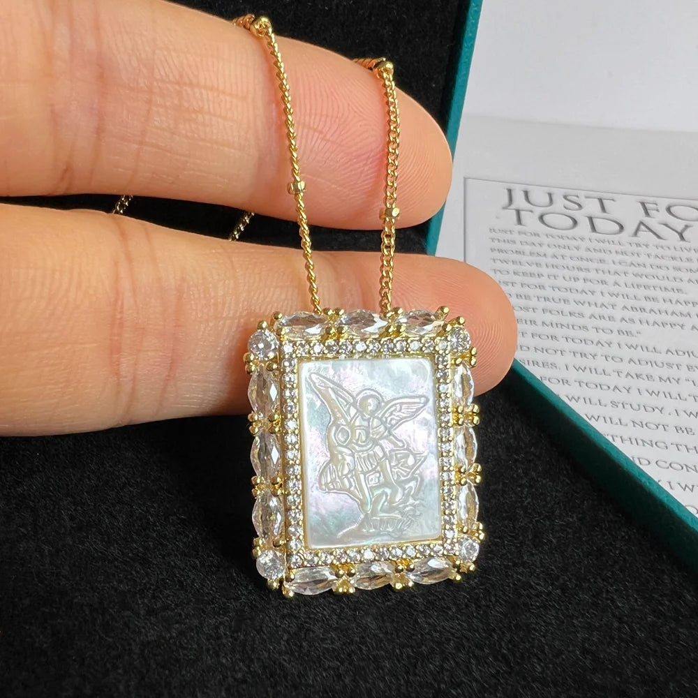 Natural Mother Pearl Shell Virgin Mary Guadalupe San Benito Charm Necklace Rectangle Religious Medals Necklace for Women & Gift