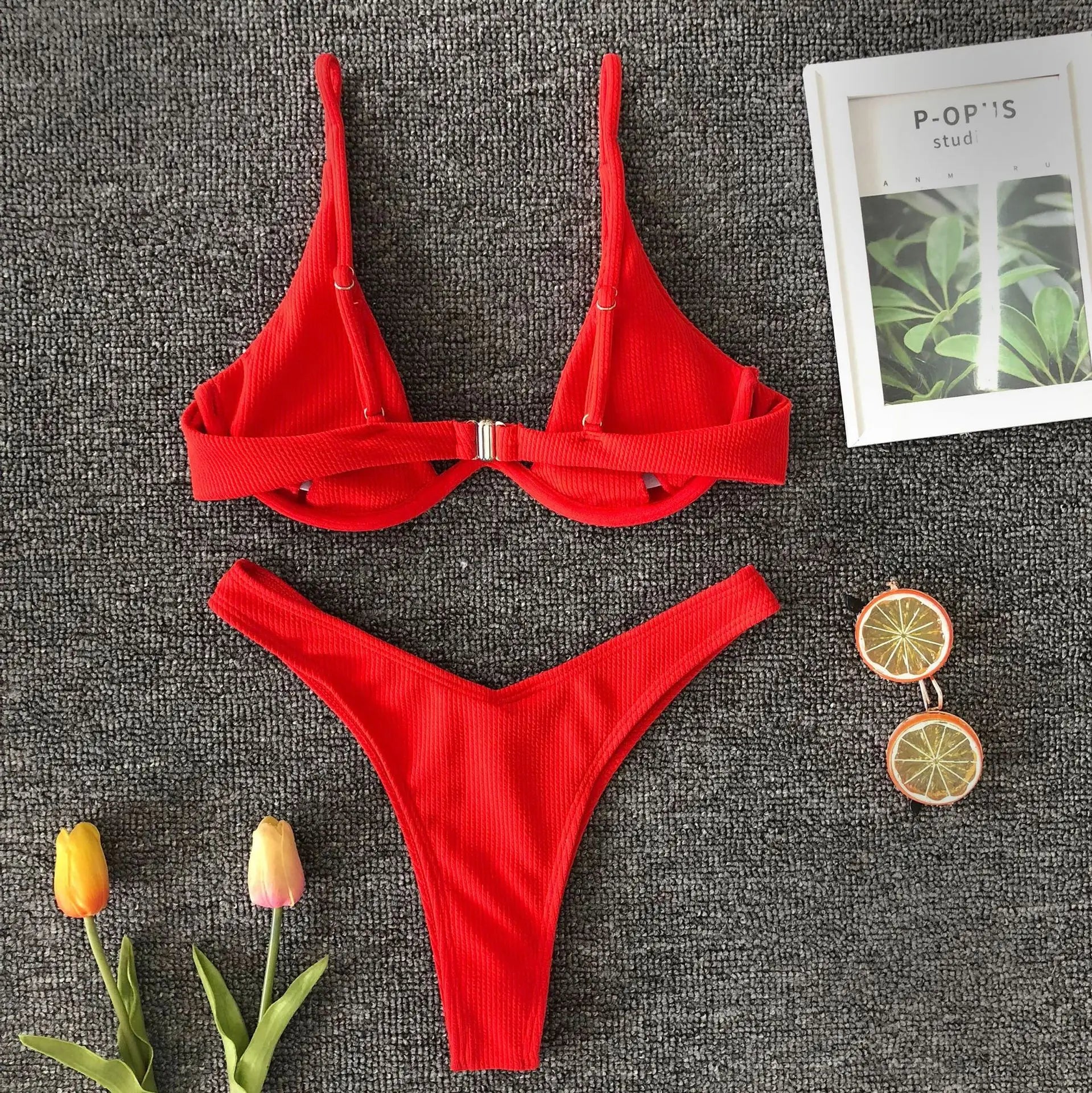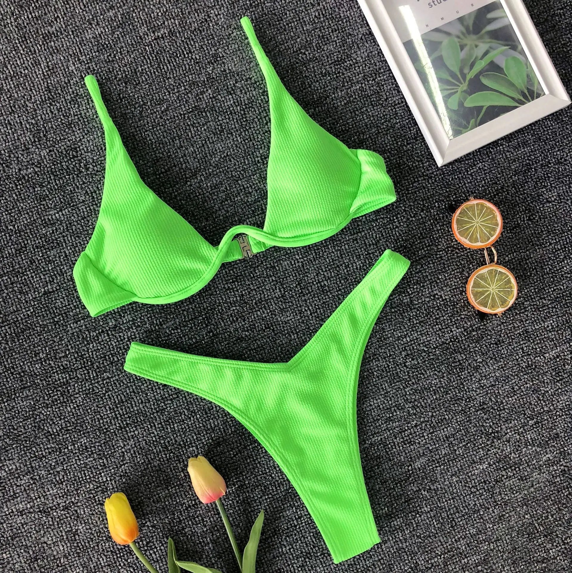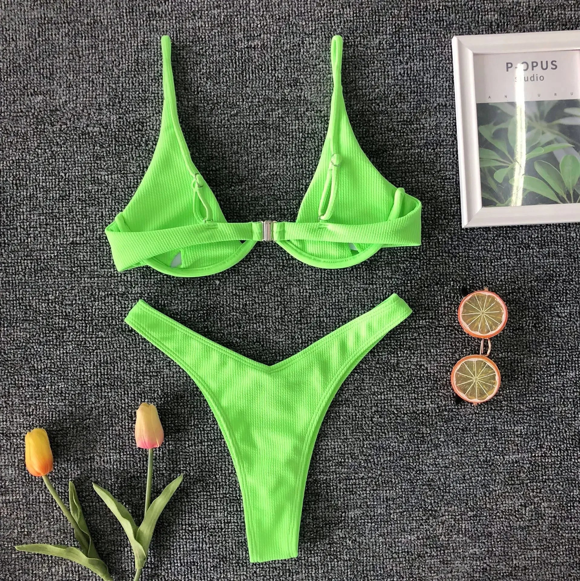 Neon Green Sexy Underwire Bikini Set 2024 Women Solid Leopard Push Up Micro Swimsuit Summer Bathing Suit Thong Swimwear Biquini