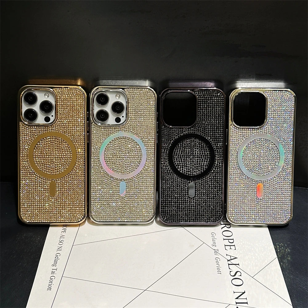 Original For Magsafe Diamond Pattern Phone Case For iPhone 17 16 15 14 12 13 11 Pro Max Plus Magnetic Bling Shiny Solid Cover