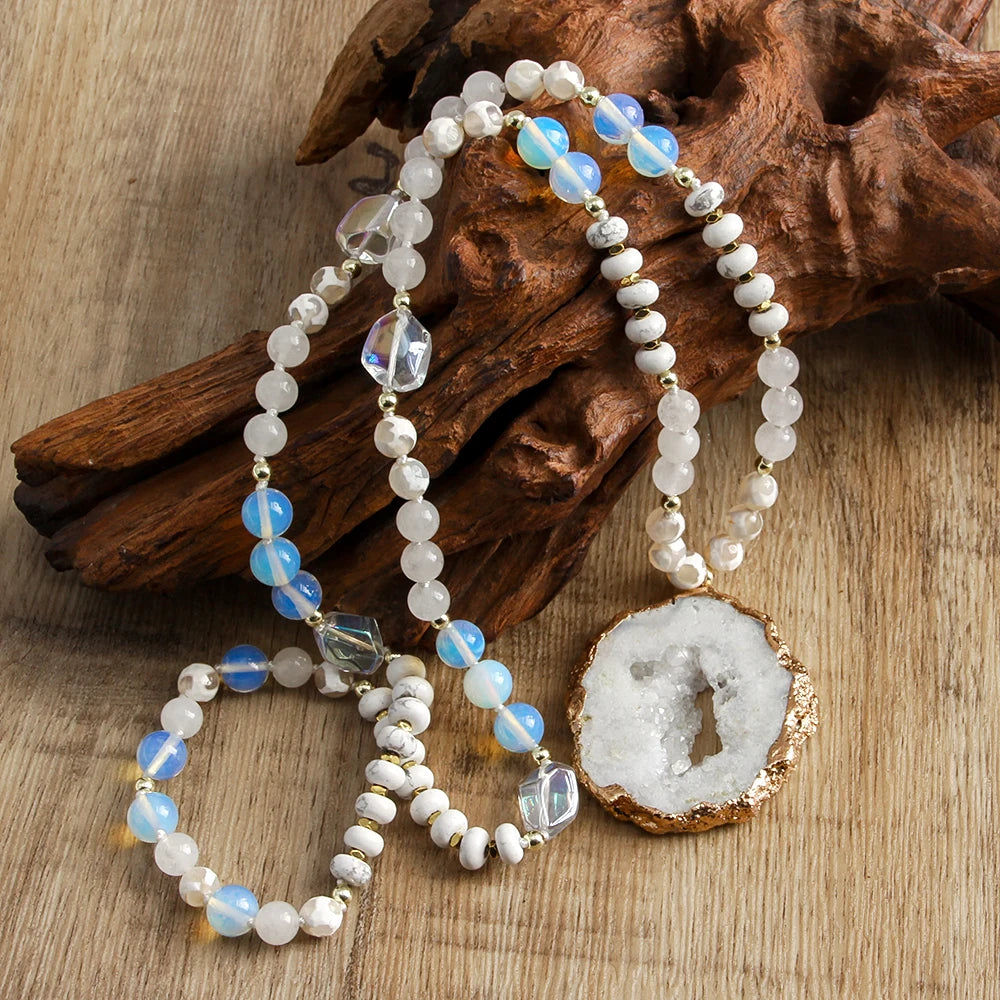 RH 2025 New Fashion Bohemian Style Natural Stone Glass Hematite Knotted Exaggerated Irregular Multicolor Druzy PendantNecklace