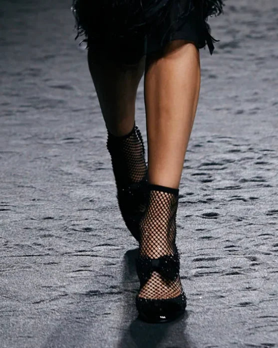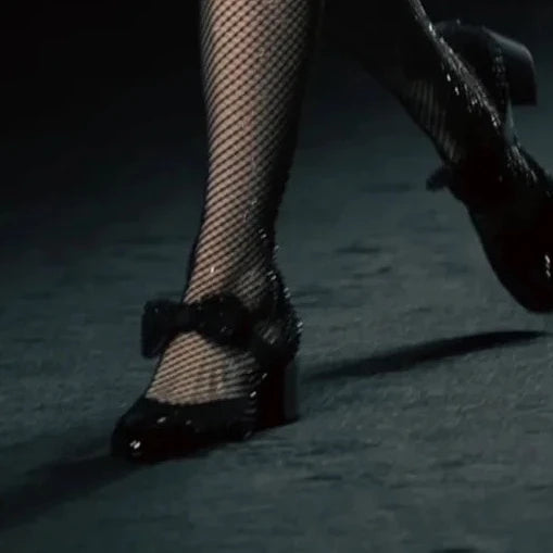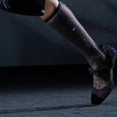 Rhinestone Mesh Upper Bow Mary Janes Shoes Block High Heels Splicing Elastic Slip-on Designer Women's Elegance Party Footweant