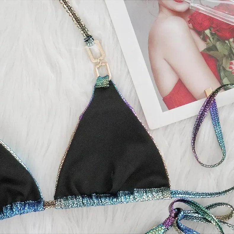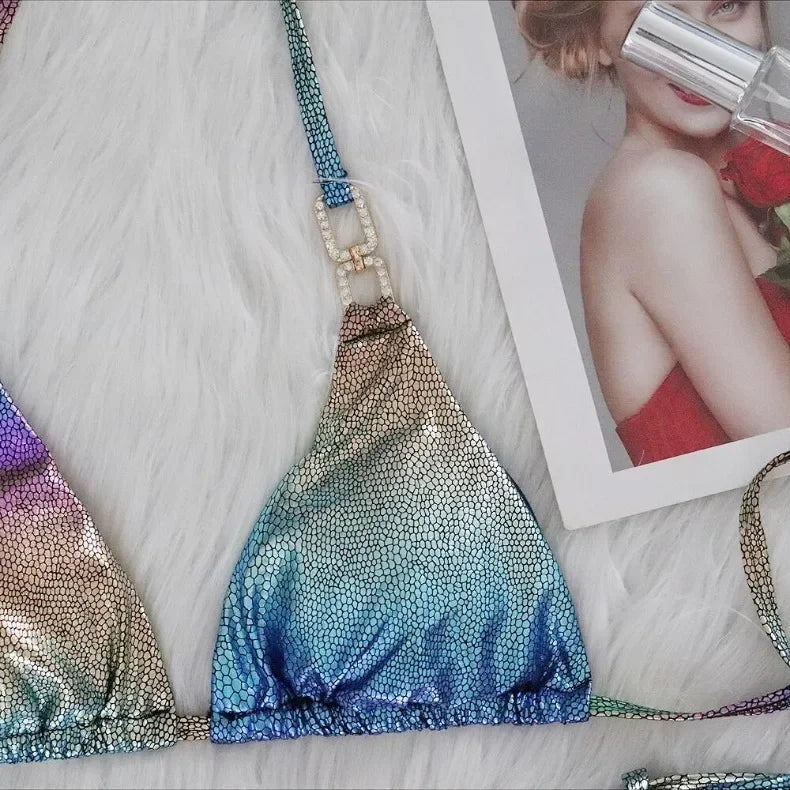 Sexy Bikini Women Swimwear Swimsuit Colorful Shiny Gradient Snakeskin Print Rhinestones Beach Bikinis Set Bathing Suit 2024 New
