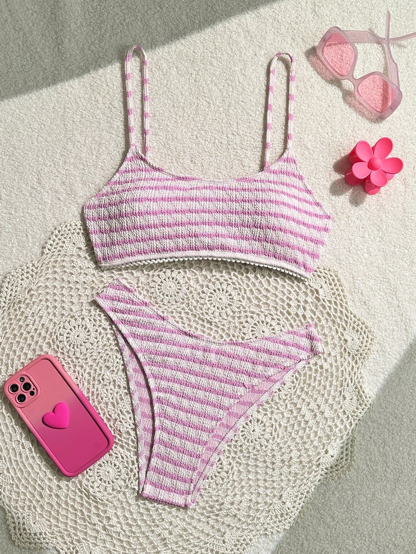 Sexy Black Striped Bikinis 2024 Women Halter Pleate Push Up Micro Swimsuit Brazilian Beach Bathing Suit Holiday Thong Swimwear