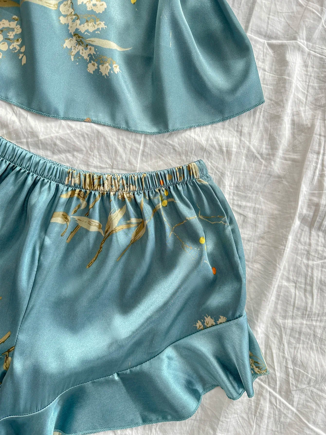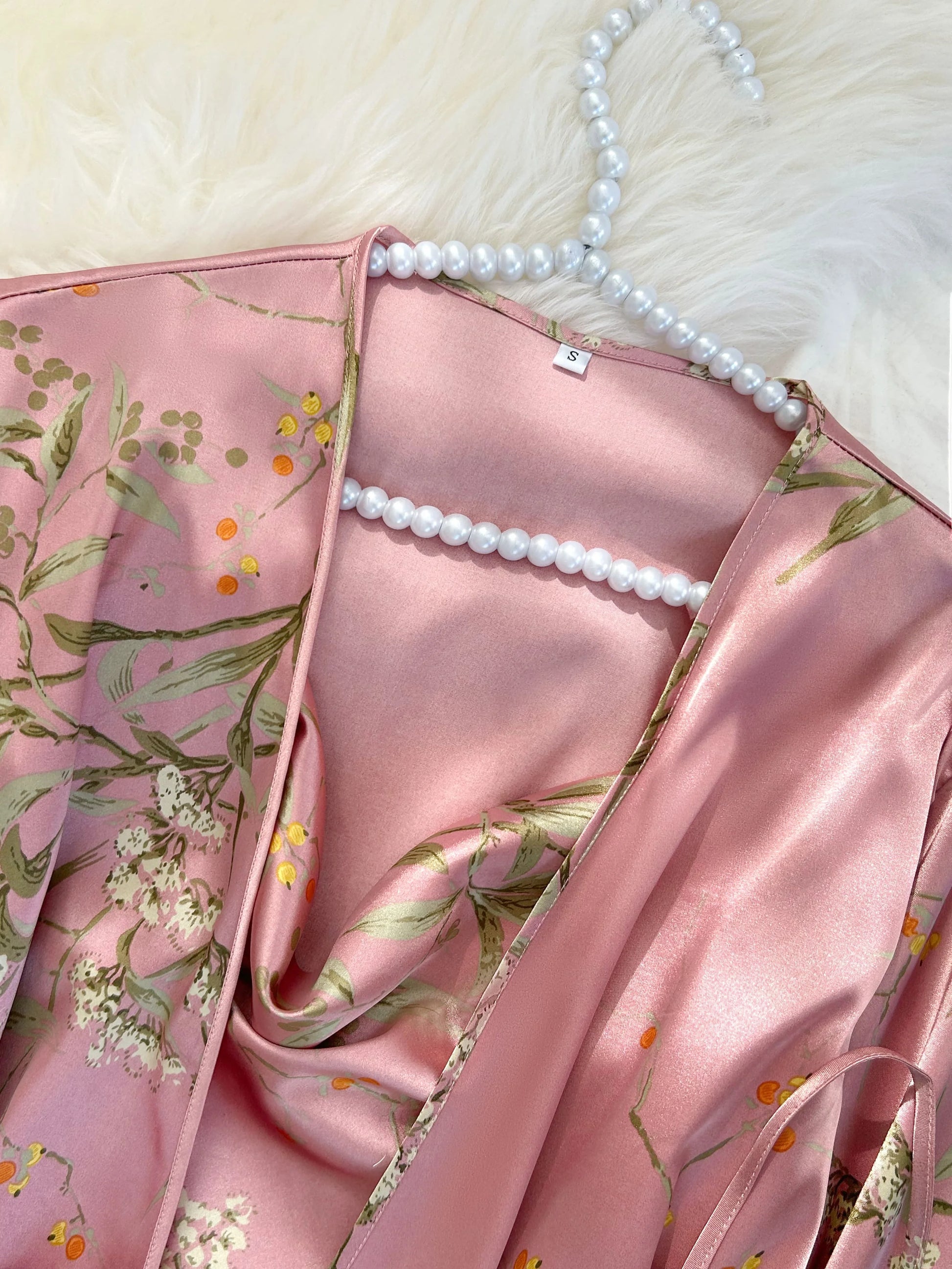 Summer irregular cherry print comfortable bathrobe and halter shorts sexy women's pajama four-piece set