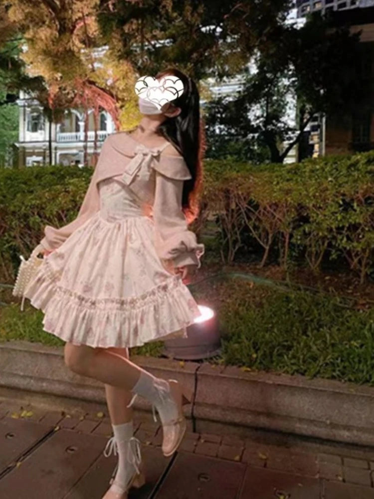 Sweet Bow Corduroy Long Sleeve Tops Women+ Y2k Gentle Slim Waist Bottoming Camisole Floral Dress Spring New Two Piece Sets